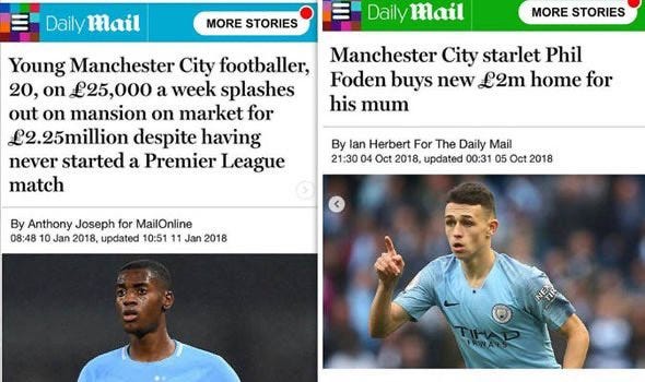 On the right is a piece about Phil Foden essentially doing the same thing. But it is received much differently by the same publication. Foden is referred to as a “starlet” despite only playing a little over 300 minutes of senior football the season before. The headline doesn’t get into specifics regarding the price of the house Foden bought, but made sure to clarify that the property was purchased for his mother — not as some self-interested splurge, but as a “home”.